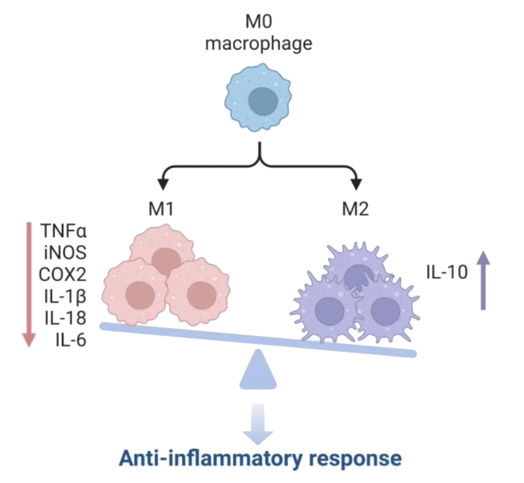 La tecnología QMR reduce la inflamación local al polarizar los macrófagos M1 hacia macrófagos M2 (los de acción antiinflamatoria).